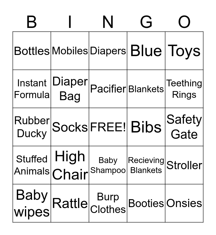 This bingo card has a free space and 24 words: High Chair, Rattle, Pacifier, Baby wipes, Toys, Bottles, Instant Formula, Mobiles, Bibs, Baby Shampoo, Blankets, Rubber Ducky, Recieving Blankets, Stroller, Diaper Bag, Booties, Safety Gate, Diapers, Teething Rings, Socks, Onsies, Stuffed Animals, Blue and Burp Clothes.