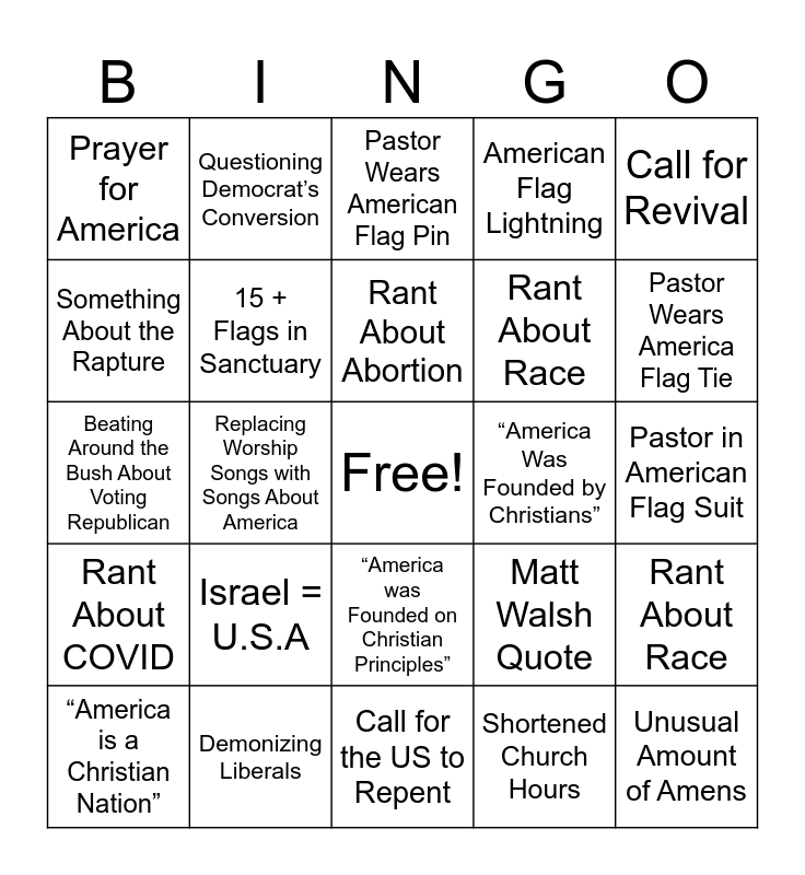 This bingo card has a free space and 24 words: Israel = U.S.A, Demonizing Liberals, Rant About Abortion, “America is a Christian Nation”, Call for Revival, Prayer for America, Something About the Rapture, Questioning Democrat’s Conversion, “America Was Founded by Christians”, “America was Founded on Christian Principles”, Rant About Race, Beating Around the Bush About Voting Republican, Matt Walsh Quote, Rant About Race, 15 + Flags in Sanctuary, Shortened Church Hours, Pastor in American Flag Suit, Pastor Wears American Flag Pin, Pastor Wears America Flag Tie, Replacing Worship Songs with Songs About America, Unusual Amount of Amens, Rant About COVID, American Flag Lightning and Call for the US to Repent.