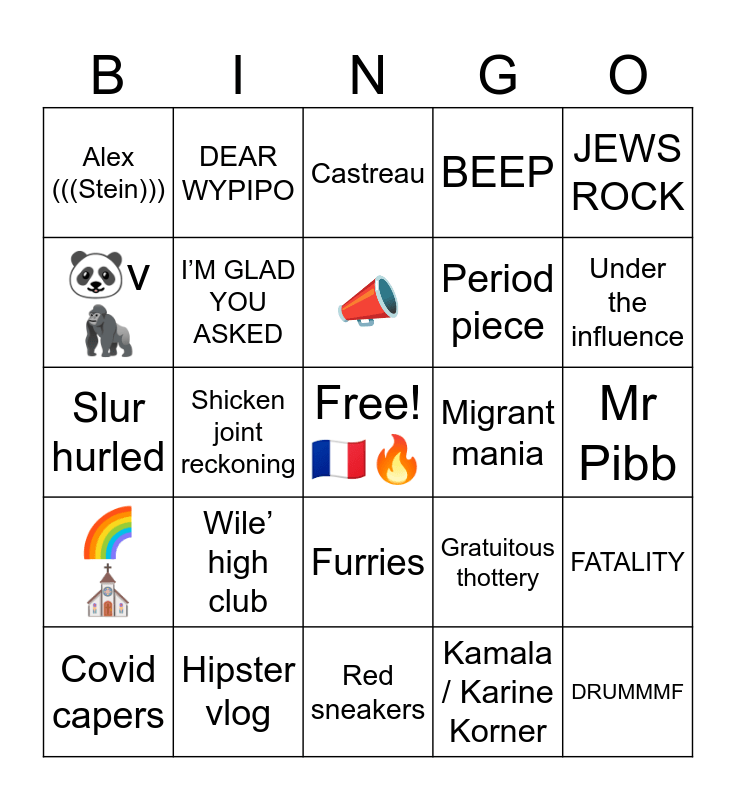 This bingo card has a free space and 24 words: Wile’ high club, Hipster vlog, 📣, Covid capers, JEWS ROCK, Alex (((Stein))), 🐼v🦍, DEAR WYPIPO, Migrant mania, Furries, Period piece, Slur hurled, Gratuitous thottery, FATALITY, I’M GLAD YOU ASKED, Kamala / Karine Korner, Mr Pibb, Castreau, Under the influence, Shicken joint reckoning, DRUMMMF, 🌈⛪, BEEP and Red sneakers.