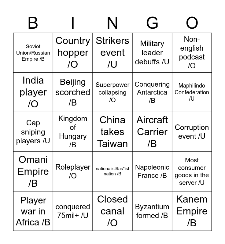This bingo card has a free space and 24 words: Roleplayer /O, conquered 75mil+ /U, Superpower collapsing /O, Player war in Africa /B, Non-english podcast /O, Soviet Union/Russian Empire /B, India player /O, Country hopper /O, Aircraft Carrier /B, nationalist/fas*ist nation /B, Conquering Antarctica /B, Cap sniping players /U, Napoleonic France /B, Most consumer goods in the server /U, Beijing scorched /B, Byzantium formed /B, Corruption event /U, Strikers event /U, Maphilindo Confederation /U, Kingdom of Hungary /B, Kanem Empire /B, Omani Empire /B, Military leader debuffs /U and Closed canal /O.
