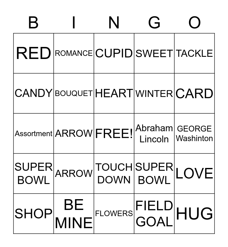 This bingo card has a free space and 24 words: ARROW, BE MINE, HEART, SHOP, TACKLE, RED, CANDY, ROMANCE, Abraham Lincoln, TOUCH DOWN, WINTER, Assortment, SUPER BOWL, LOVE, BOUQUET, FIELD GOAL, GEORGE Washinton, CUPID, CARD, ARROW, HUG, SUPER BOWL, SWEET and FLOWERS.