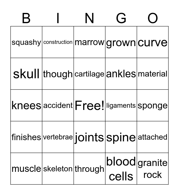 This bingo card has a free space and 24 words: vertebrae, skeleton, cartilage, muscle, curve, squashy, skull, construction, ligaments, joints, ankles, knees, spine, attached, though, blood cells, sponge, marrow, material, accident, granite rock, finishes, grown and through.