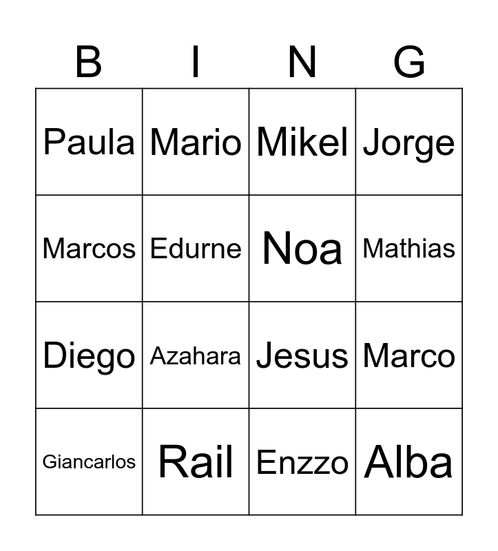 This bingo card has 20 words: Marco, Claudia, Mikel, Nayala, Giancarlos, Marcos, Rail, Paula, Diego, Mario, Azahara, Jesus, Edurne, Alba, Noa, Abel, Mathias, Jorge, Enzzo and Aimar.