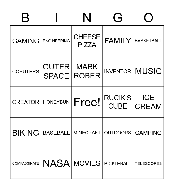 This bingo card has a free space and 24 words: BASEBALL, NASA, MARK ROBER, COMPASSINATE, BASKETBALL, GAMING, COPUTERS, ENGINEERING, RUCIK'S CUBE, MINECRAFT, INVENTOR, CREATOR, OUTDOORS, CAMPING, OUTER SPACE, PICKLEBALL, ICE CREAM, CHEESE PIZZA, MUSIC, HONEYBUN, TELESCOPES, BIKING, FAMILY and MOVIES.