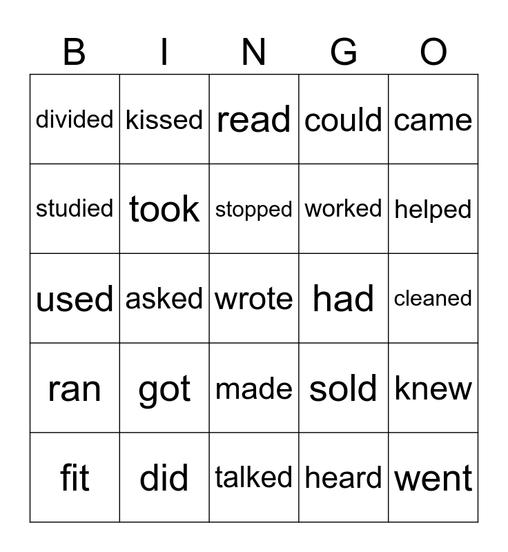 This bingo card has a free space and 44 words: kept, went, was/were, fit, spoke, heard, read, thought, came, did, could, had, made, got, started, talked, waited, used, arrived, helped, kissed, listened, enjoyed, divided, cried, cleaned, called, told, sold, ran, found, knew, let, lost, asked, liked, loved, opened, stopped, studied, worked, finished, took and put.