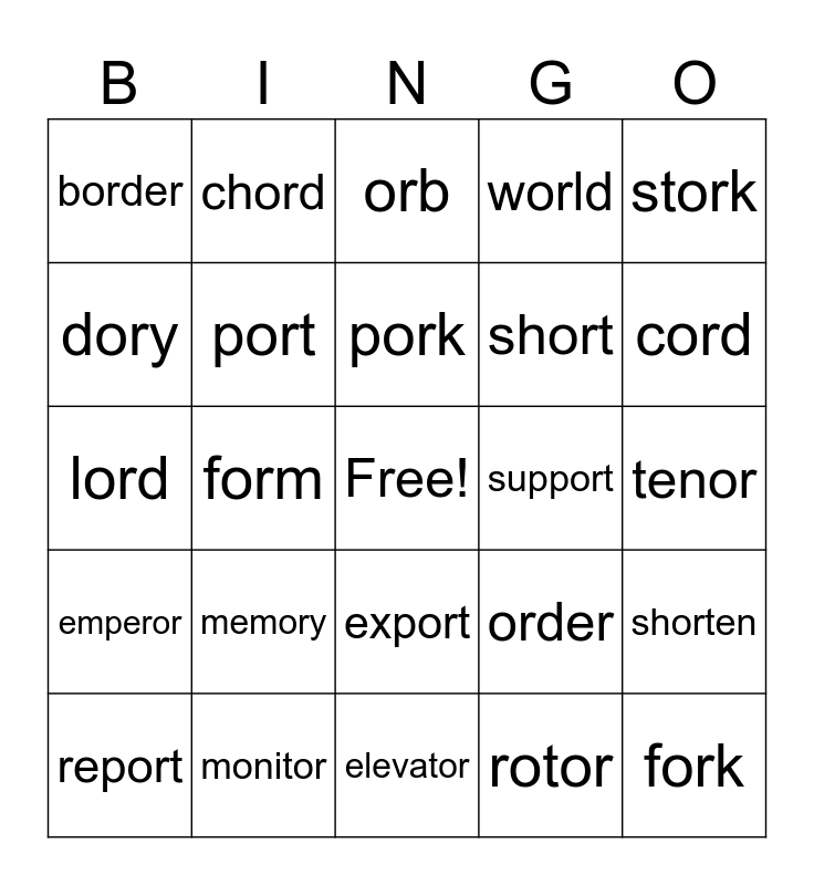 This bingo card has a free space and 77 words: for, nor, orb, corn, born, torn, worn, horn, forth, coral, dorm, storm, pork, dory, worm, form, word, fork, cork, stork, sort, lord, port, chord, world, decor, torch, major, porch, north, actor, razor, odor, order, cord, short, story, ivory, tenor, rotor, motor, sport, moral, forty, anchor, sailor, report, border, record, worker, forgot, export, resort, mortar, reform, effort, origin, tailor, normal, import, memory, factor, editor, forest, corona, forget, orange, support, worldly, forward, tornado, shorten, emperor, monitor, platform, elevator and border.