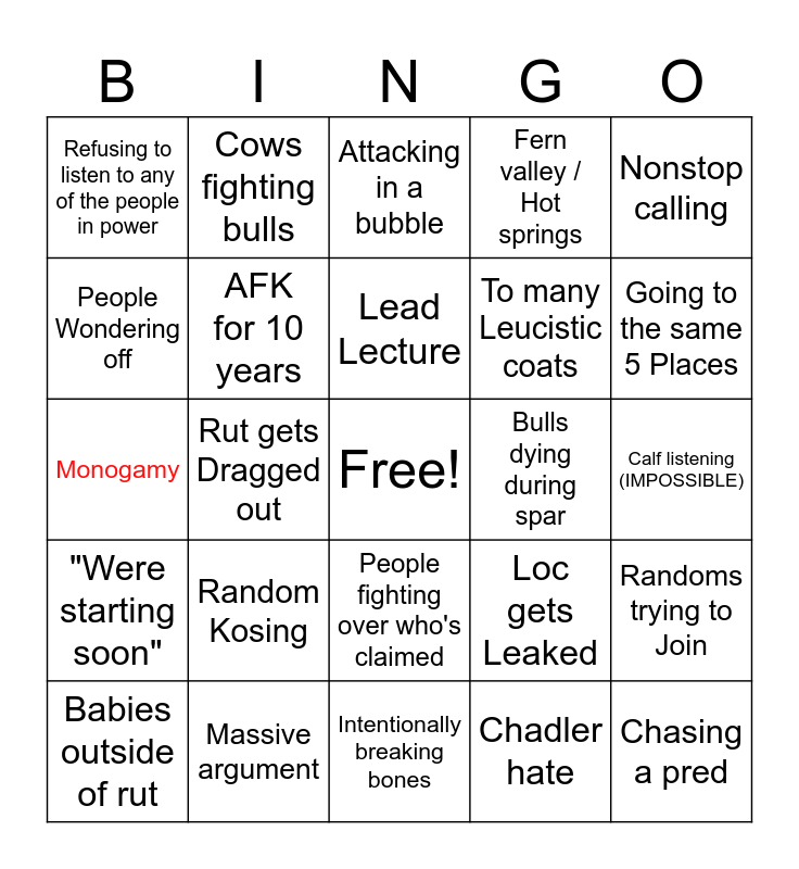 This bingo card has a free space and 24 words: Random Kosing, Massive argument, Lead Lecture, Babies outside of rut, Nonstop calling, Refusing to listen to any of the people in power, People Wondering off, Cows fighting bulls, Bulls dying during spar, People fighting over who's claimed, To many Leucistic coats, Monogamy, Loc gets Leaked, Randoms trying to Join, AFK for 10 years, Chadler hate, Calf listening (IMPOSSIBLE), Attacking in a bubble, Going to the same 5 Places, Rut gets Dragged out, Chasing a pred, "Were starting soon", Fern valley / Hot springs and Intentionally breaking bones.