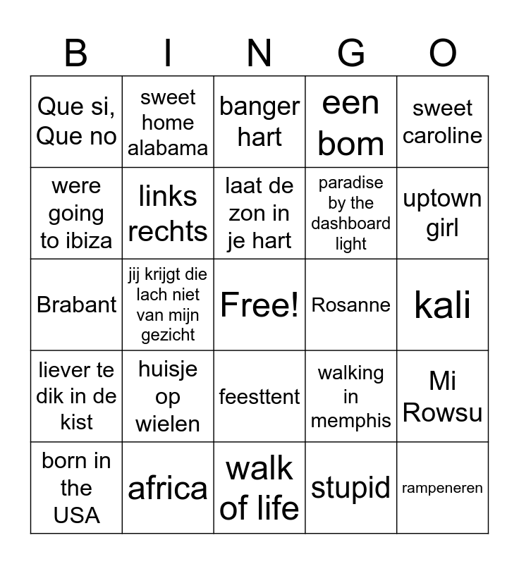 This bingo card has a free space and 40 words: Dromendans, Brabant, Het regent zonnestralen, links rechts, africa, feesttent, laat de zon in je hart, cowboys en indianen, sweet caroline, liever te dik in de kist, jij krijgt die lach niet van mijn gezicht, een bom, rampeneren, kali, Rosanne, huisje op wielen, mooie blauwe ogen, Que si, Que no, stap voor stap, banger hart, Mi Rowsu, stupid, paradise by the dashboard light, were going to ibiza, knockin on heavens door, you never walk alone, why tell me why, lion in the morning sun, vier zomers lang, summer of 69, life is a highway, born in the USA, we built this city, walking in memphis, uptown girl, walk of life, eye of the tiger, livin' on a prayer, sweet home alabama and sweet child o' mine.