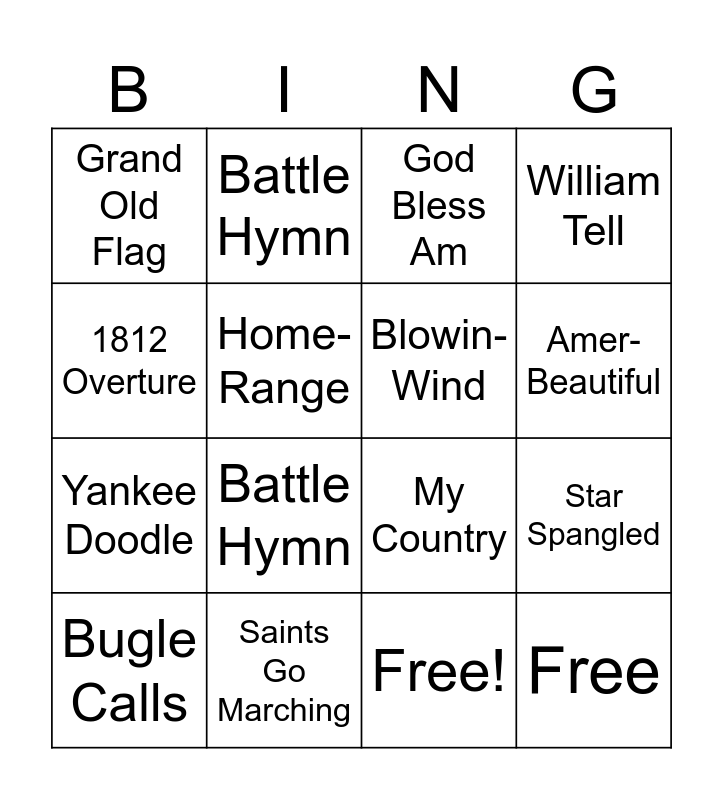 This bingo card has 17 words: Free!, Bugle Calls, God Bless Am, Grand Old Flag, Battle Hymn, William Tell, Star Spangled, Blowin-Wind, Amer-Beautiful, Home-Range, Saints Go Marching, My Country, 1812 Overture, Battle Hymn, Yankee Doodle, We-Overcome and Free.