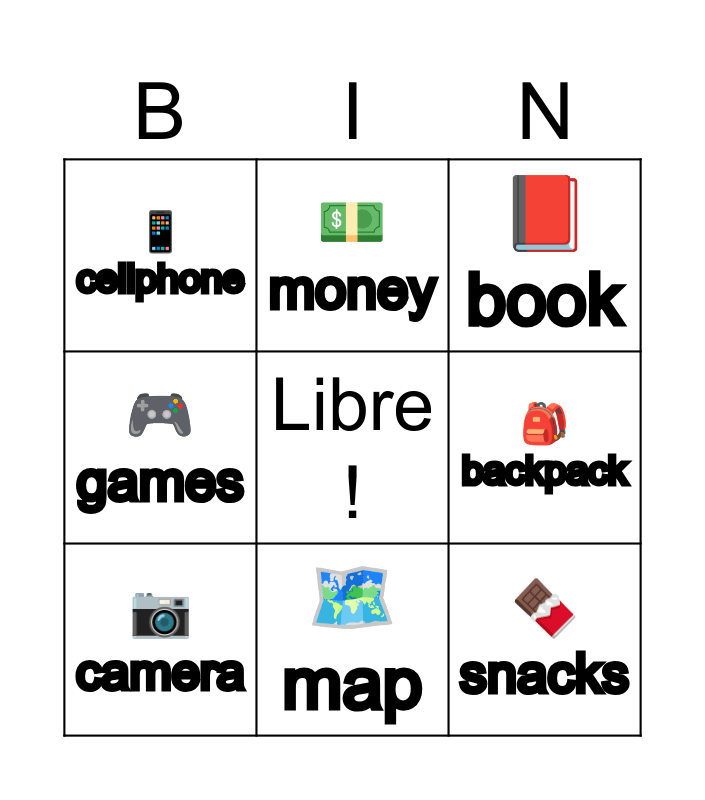 This bingo card has a free space and 11 words: 🧳 suitcase, 🗺️ map, 🍫 snacks, 📷 camera, 💵 money, 📕 book, 🎒 backpack, 🎧 headphones, 🎮 games, 📱 cellphone and 🚌 bus.