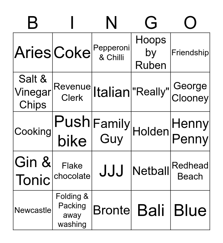 This bingo card has a free space and 24 words: Flake chocolate, Folding & Packing away washing, Italian, Newcastle, Friendship, Aries, Salt & Vinegar Chips, Coke, Holden, JJJ, "Really", Cooking, Netball, Redhead Beach, Revenue Clerk, Bali, Henny Penny, Pepperoni & Chilli, George Clooney, Push bike, Blue, Gin & Tonic, Hoops by Ruben and Bronte.