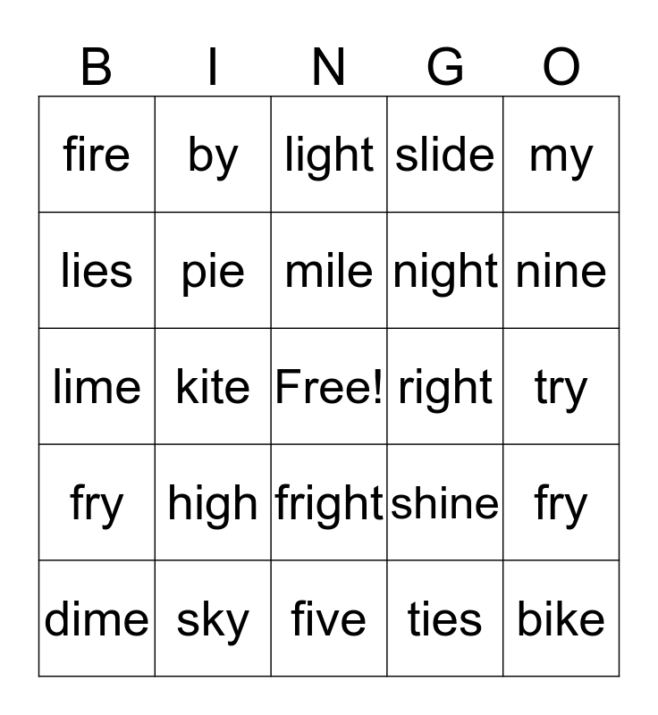 This bingo card has a free space and 24 words: high, sky, mile, dime, my, fire, lies, by, right, fright, night, lime, shine, fry, pie, ties, try, light, nine, kite, bike, fry, slide and five.