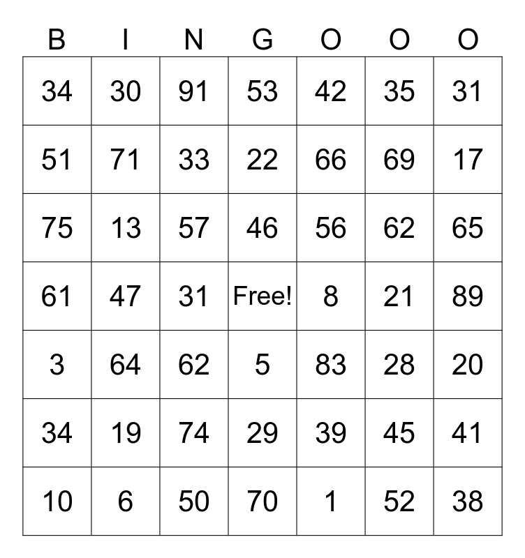 This bingo card has a free space and 118 words: 1, 16, 31, 46, 61, 2, 17, 32, 47, 62, 3, 18, 48, 63, 4, 19, 33, 49, 64, 5, 20, 34, 50, 65, 1, 21, 41, 61, 81, 2, 22, 42, 62, 82, 3, 23, 43, 63, 83, 4, 24, 44, 64, 84, 5, 25, 45, 65, 85, 6, 26, 46, 66, 86, 7, 27, 47, 67, 87, 8, 28, 48, 68, 88, 9, 29, 49, 69, 89, 10, 30, 50, 70, 90, 11, 31, 51, 71, 91, 12, 32, 52, 72, 92, 13, 33, 53, 73, 93, 14, 34, 54, 74, 94, 15, 35, 55, 75, 95, 16, 36, 56, 76, 96, 17, 37, 57, 77, 97, 18, 38, 58, 78, 98, 19, 39, 59 and 79.