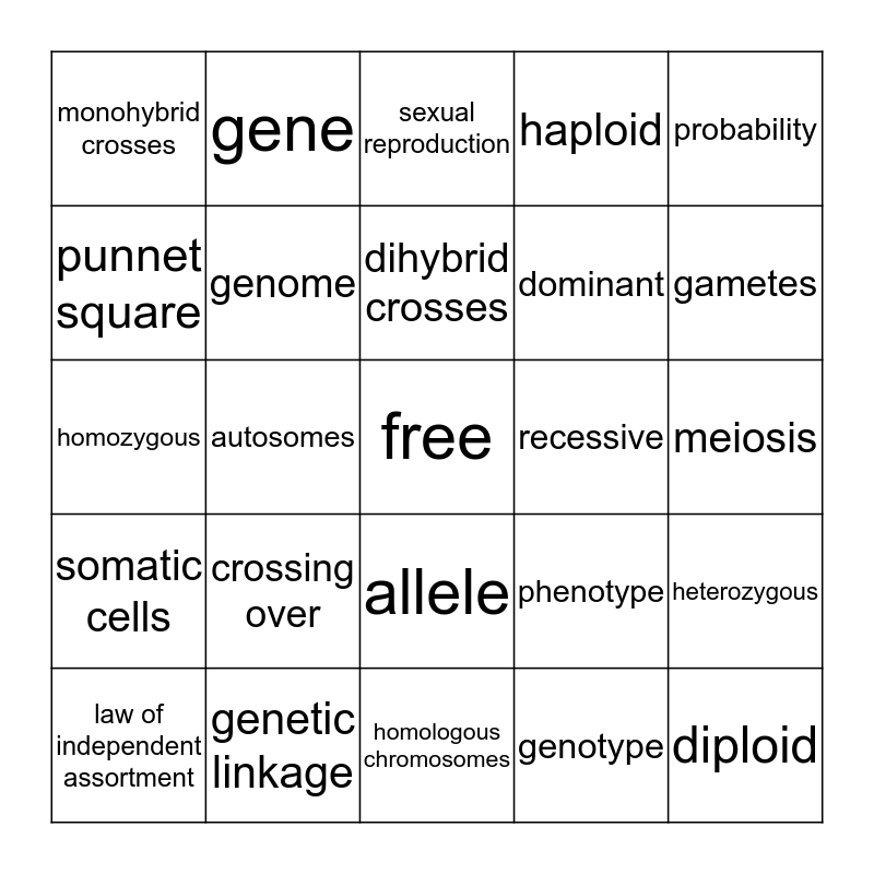 This bingo card has a free space and 24 words: crossing over, genetic linkage, dihybrid crosses, law of independent assortment, probability, monohybrid crosses, punnet square, gene, recessive, allele, dominant, homozygous, phenotype, heterozygous, genome, genotype, meiosis, sexual reproduction, gametes, autosomes, diploid, somatic cells, haploid and homologous chromosomes.