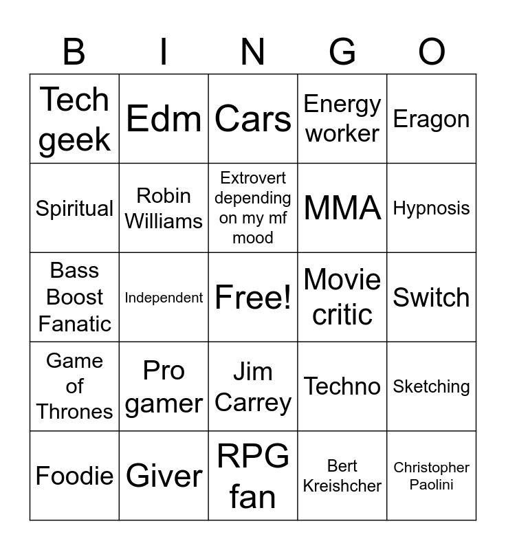 This bingo card has a free space and 24 words: Pro gamer, Giver, Extrovert depending on my mf mood, Foodie, Eragon, Tech geek, Spiritual, Edm, Movie critic, Jim Carrey, MMA, Bass Boost Fanatic, Techno, Sketching, Robin Williams, Bert Kreishcher, Switch, Cars, Hypnosis, Independent, Christopher Paolini, Game of Thrones, Energy worker and RPG fan.