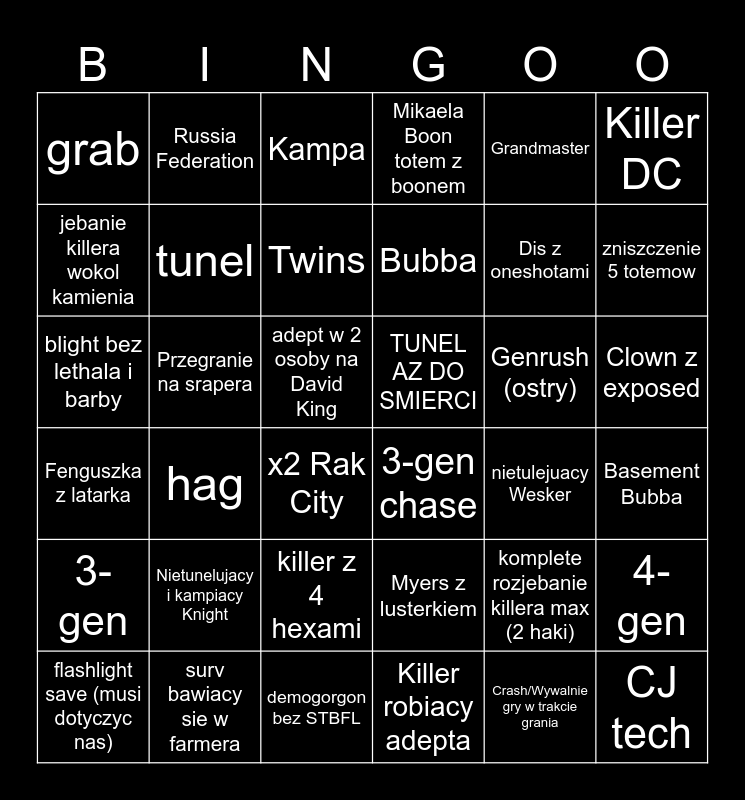 This bingo card has 36 words: Myers z lusterkiem, killer z 4 hexami, Killer robiacy adepta, jebanie killera wokol kamienia, Fenguszka z latarka, TUNEL AZ DO SMIERCI, tunel, demogorgon bez STBFL, Grandmaster, komplete rozjebanie killera max (2 haki), zniszczenie 5 totemow, Mikaela Boon totem z boonem, 4-gen, Przegranie na srapera, Bubba, grab, 3-gen, Genrush (ostry), blight bez lethala i barby, Kampa, adept w 2 osoby na David King, hag, 3-gen chase, x2 Rak City, nietulejuacy Wesker, Russia Federation, Dis z oneshotami, surv bawiacy sie w farmera, Twins, Killer DC, CJ tech, flashlight save (musi dotyczyc nas), Basement Bubba, Clown z exposed, Nietunelujacy i kampiacy Knight and Crash/Wywalnie gry w trakcie grania.
