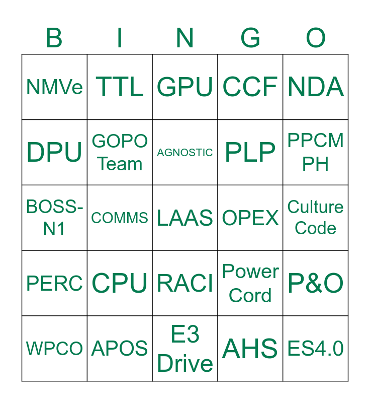 This bingo card has a free space and 24 words: CPU, APOS, AGNOSTIC, WPCO, NDA, NMVe, DPU, TTL, OPEX, RACI, PLP, BOSS-N1, Power Cord, P&O, GOPO Team, AHS, Culture Code, GPU, PPCM PH, COMMS, ES4.0, PERC, CCF and E3 Drive.
