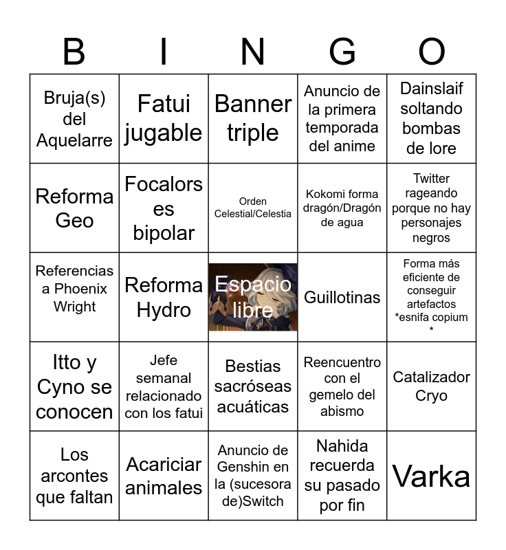 This bingo card has a free space and 24 words: Jefe semanal relacionado con los fatui, Acariciar animales, Orden Celestial/Celestia, Los arcontes que faltan, Dainslaif soltando bombas de lore, Bruja(s) del Aquelarre, Reforma Geo, Fatui jugable, Guillotinas, Bestias sacróseas acuáticas, Kokomi forma dragón/Dragón de agua, Referencias a Phoenix Wright, Reencuentro con el gemelo del abismo, Catalizador Cryo, Focalors es bipolar, Nahida recuerda su pasado por fin, Forma más eficiente de conseguir artefactos *esnifa copium *, Banner triple, Twitter rageando porque no hay personajes negros, Reforma Hydro, Varka, Itto y Cyno se conocen, Anuncio de la primera temporada del anime and Anuncio de Genshin en la (sucesora de)Switch.