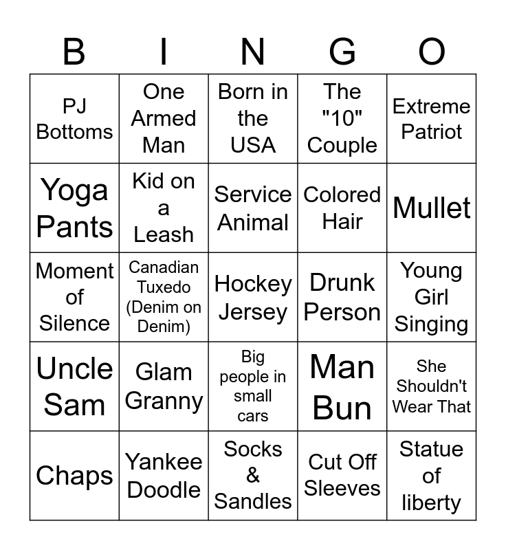 This bingo card has 46 words: Free!, Hockey Jersey, Man on Stiltz, Socks & Sandles, Glam Granny, Nose Picker, One Armed Man, Handlebar Moustache, Yoga Pants, Monster Logo, Kid on a Leash, The "10" Couple, She Shouldn't Wear That, Man Bun, Eye Patch, Woman with Face Tatoo, Service Animal, Drunk Person, Scooter/Rascal, Extreme Patriot, Canadian Tuxedo (Denim on Denim), Cut Off Sleeves, PJ Bottoms, Colored Hair, Overalls, Mullet, Chaps, Crying Baby, Big people in small cars, Uncle Sam, Band fake playing music, Non-themed vehicle in parade, Horses, Star spangled banner, God Bless America, Yankee Doodle, Young Girl Singing, Boy Scouts, Girl Scouts, Colonial Attire, Statue of liberty, Born in the USA, Moment of Silence, Red Solo Cup, Fireworks and Drag Queen.