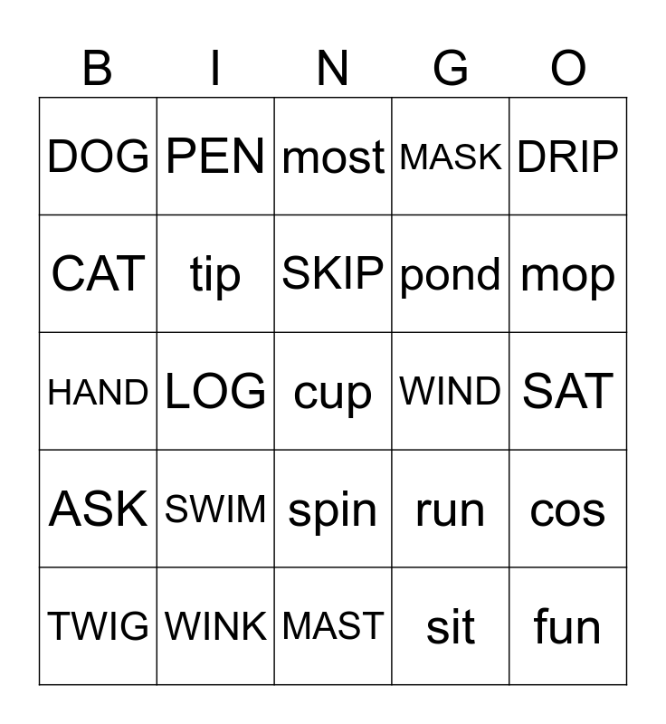 This bingo card has a free space and 24 words: SWIM, WINK, SKIP, TWIG, DRIP, DOG, CAT, PEN, WIND, spin, pond, HAND, run, cos, tip, sit, SAT, most, mop, LOG, fun, ASK, MASK and MAST.