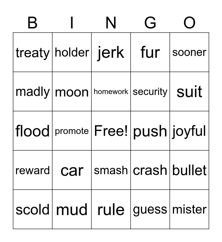 This bingo card has a free space and 34 words: gray, guess, Confession, sword, reward, moon, sooner, scold, holder, food, homework, jerk, gloomy, rarely, push, suit, mud, flood, car, crash, smash, nearly, treaty, joyful, rule, mister, fur, few, security, madly, coast, promote, bullet and featch.