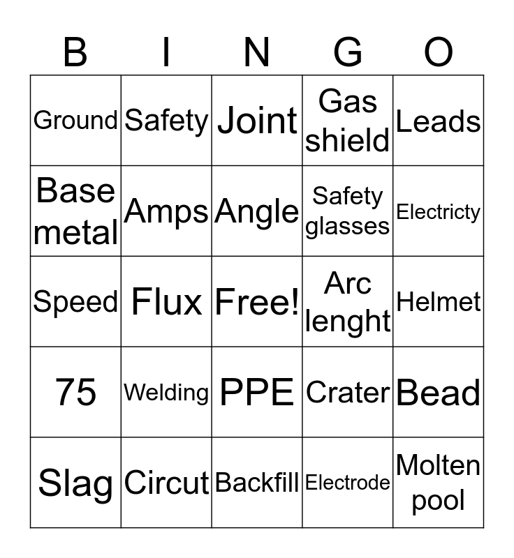 This bingo card has a free space and 24 words: Welding, Circut, Angle, Slag, Leads, Ground, Base metal, Safety, Arc lenght, PPE, Safety glasses, Speed, Crater, Bead, Amps, Electrode, Helmet, Joint, Electricty, Flux, Molten pool, 75, Gas shield and Backfill.