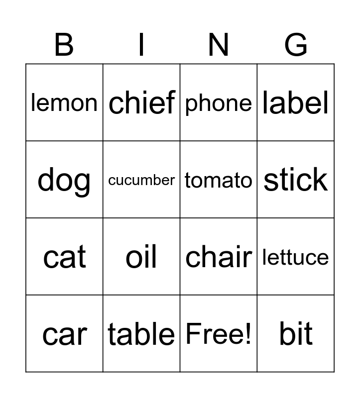 This bingo card has 17 words: Free!, car, phone, lemon, oil, label, lettuce, tomato, stick, cucumber, table, chair, dog, chief, cat, rab and bit.