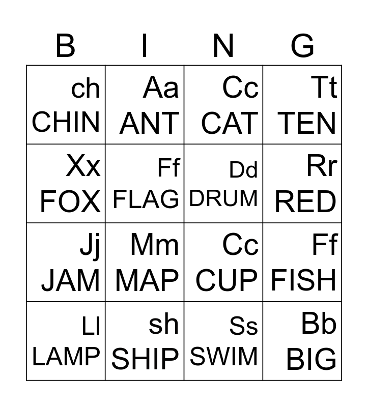 This bingo card has 16 words: sh SHIP, Ff FISH, Cc CAT, ch CHIN, Jj JAM, Aa ANT, Cc CUP, Ss SWIM, Xx FOX, Ff FLAG, Ll LAMP, Tt TEN, Mm MAP, Rr RED, Dd DRUM and Bb BIG.