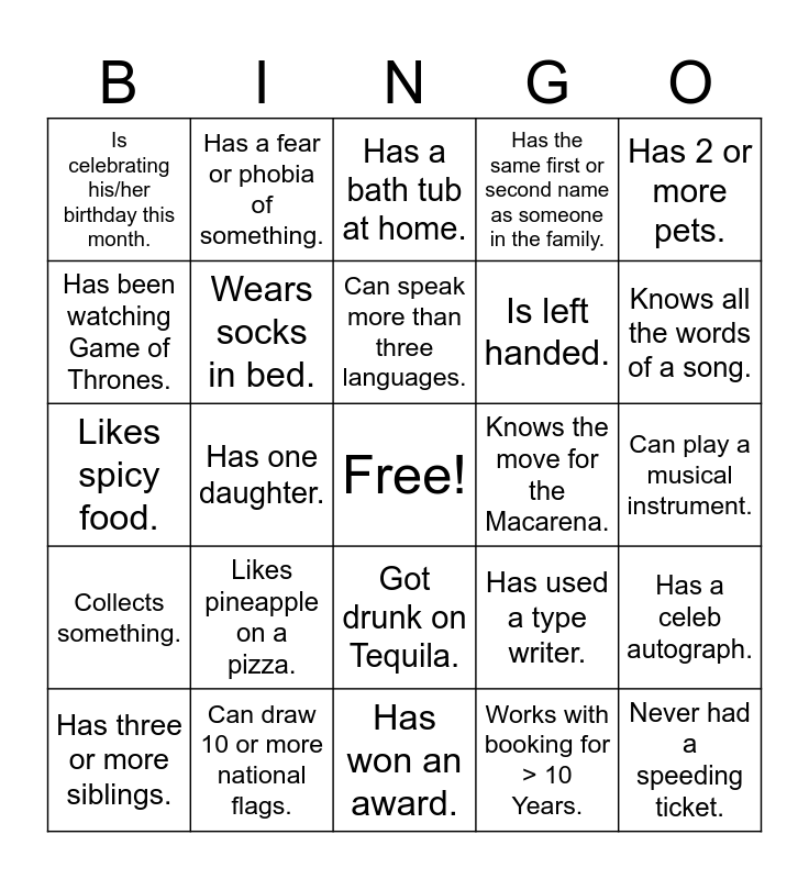 This bingo card has a free space and 24 words: Likes pineapple on a pizza., Can draw 10 or more national flags., Can speak more than three languages., Has three or more siblings., Has 2 or more pets., Is celebrating his/her birthday this month., Has been watching Game of Thrones., Has a fear or phobia of something., Knows the move for the Macarena., Got drunk on Tequila., Is left handed., Likes spicy food., Has used a type writer., Has a celeb autograph., Wears socks in bed., Works with booking for > 10 Years., Can play a musical instrument., Has a bath tub at home., Knows all the words of a song., Has one daughter., Never had a speeding ticket., Collects something., Has the same first or second name as someone in the family. and Has won an award..