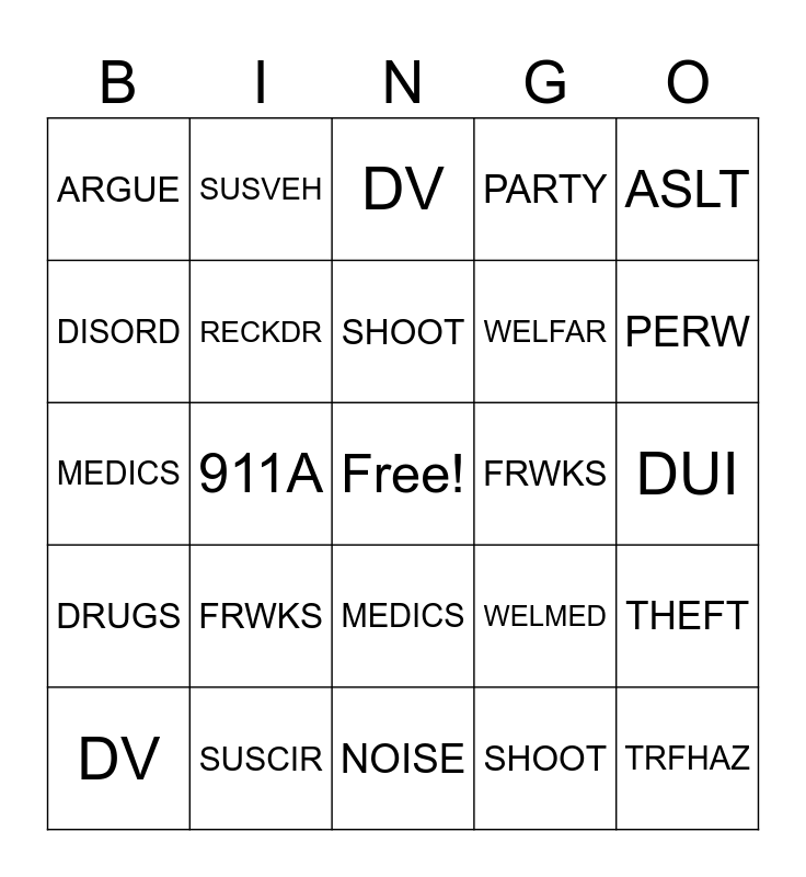This bingo card has a free space and 24 words: FRWKS, SUSCIR, SHOOT, DV, ASLT, ARGUE, DISORD, SUSVEH, FRWKS, MEDICS, WELFAR, MEDICS, WELMED, THEFT, RECKDR, SHOOT, DUI, DV, PERW, 911A, TRFHAZ, DRUGS, PARTY and NOISE.