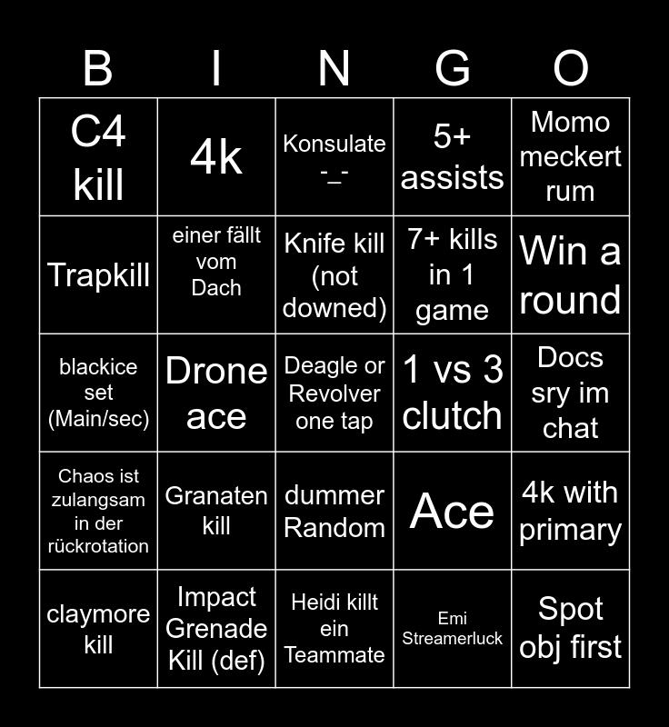 This bingo card has 25 words: Granaten kill, Heidi killt ein Teammate, Knife kill (not downed), claymore kill, Momo meckert rum, C4 kill, Trapkill, 4k, 1 vs 3 clutch, dummer Random, 7+ kills in 1 game, blackice set (Main/sec), Ace, 4k with primary, einer fällt vom Dach, Spot obj first, Docs sry im chat, Konsulate -_-, Win a round, Drone ace, Deagle or Revolver one tap, Impact Grenade Kill (def), Chaos ist zulangsam in der rückrotation, 5+ assists and Emi Streamerluck.