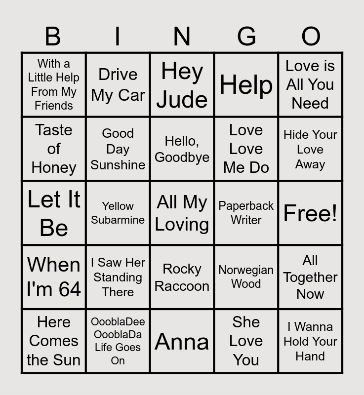 This bingo card has a free space and 34 words: Yellow Submarine, She Love You, Penny Lane, Twist and Shout, When I'm 64, Good Day Sunshine, Love is All You Need, Here Comes the Sun, Drive My Car, Hard Day's Night, Hello, Goodbye, Hey Jude, Michelle, Oh Darling, Paperback Writer, Hide Your Love Away, OooblaDee OooblaDa Life Goes On, Let It Be, I Saw Her Standing There, Norwegian Wood, Rocky Raccoon, We Can Work It Out, With a Little Help From My Friends, Free!, Anna, I Wanna Hold Your Hand, Help, Got to Get You Into My Life, Love Love Me Do, Taste of Honey, Strawberry Fields, Yellow Subarmine, All Together Now and Something.