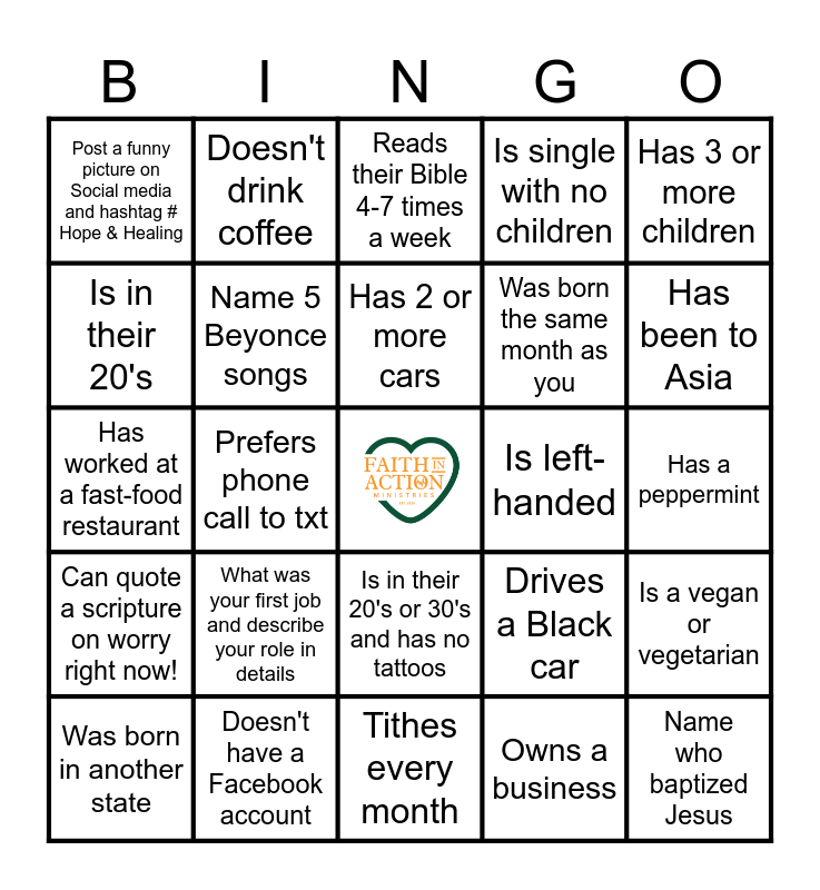 This bingo card has a free space and 24 words: What was your first job and describe your role in details, Doesn't have a Facebook account, Has 2 or more cars, Was born in another state, Has 3 or more children, Post a funny picture on Social media and hashtag # Hope & Healing, Is in their 20's, Doesn't drink coffee, Is left-handed, Is in their 20's or 30's and has no tattoos, Was born the same month as you, Has worked at a fast-food restaurant, Drives a Black car, Is a vegan or vegetarian, Name 5 Beyonce songs, Owns a business, Has a peppermint, Reads their Bible 4-7 times a week, Has been to Asia, Prefers phone call to txt, Name who baptized Jesus, Can quote a scripture on worry right now!, Is single with no children and Tithes every month.