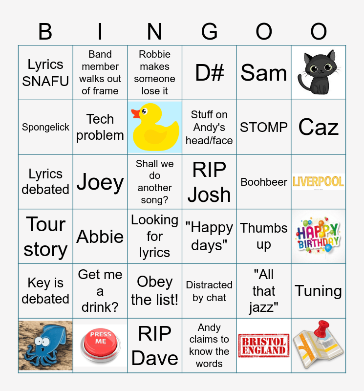 This bingo card has 8 images and 28 words: Distracted by chat, Obey the list!, Andy claims to know the words, Spongelick, Tour story, RIP Josh, Tech problem, RIP Dave, Sam, "All that jazz", Caz, D#, Tuning, Joey, Stuff on Andy's head/face, Lyrics SNAFU, Key is debated, Boohbeer, Lyrics debated, Robbie makes someone lose it, Shall we do another song?, Abbie, "Happy days", Looking for lyrics, Thumbs up, Band member walks out of frame, STOMP and Get me a drink?.