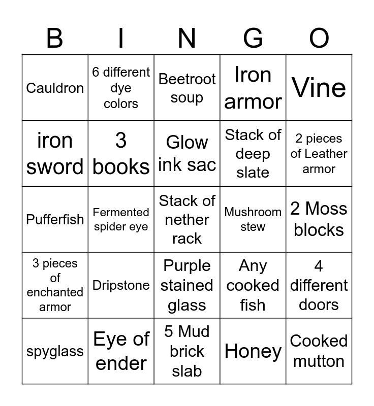 This bingo card has 108 words: All stone tools, tinted glass, Fermented spider eye, Gold block, music disk, Chiseled black stone, heart of the sea, Powered rail, Iron hoe, Saddle, Slime ball, Any type of horse armor, Comparator, Green dye, Five different crops, cake, 6 different dye colors, Rose bush, bookshelf, Crimson and warped trapdoor, Dripstone, 10 bread, Glow berries, Any fish in a bucket, Mushroom block, Vine, iron sword, Iron armor, Potion of weakness, ender pearl, Cooked mutton, Eye of ender, Brown mushroom, get all wooden tools, Nautilus shell, Beetroot soup, birch chest boat, 5 different stained glass, Two types of Leaves, Stack of nether rack, Observer, Black wool, 5 Mud brick slab, Lantern, 5 different wool colors, 3 books, Cocoa beans, Glow ink sac, pillager banner, Mushroom stew, Treasure map, 2 pieces of Leather armor, 3 pieces of enchanted armor, Barrel, Lapis block, Cooked chicken, strength potion, Carrot on a stick, All iron tools, Cauldron, Golden hoe, sticky piston, armor trim, Brown wool, iron rail, 2 pieces of Golden armor, Copper stair, 4 different doors, Any terracotta, Any cooked fish, Purple stained glass, Pufferfish, Honey, Suspicious stew, spruce sapling, Yellow stained glass, Enchanting table, brewing stand, 3 repeaters, Jukebox, Gilded black stone, Blaze rod, 3 tnt, Red carpet, 3 types of concrete, Pink dye, Glow stone block, Cooked pork chop, Note block, nether brick, 32 bone meal, Stack of deep slate, Hanging sign, Lead, Bone block, Cooked steak, Warped fungus on a stick, spyglass, Pumpkin pie, quartz stairs, Wooden hoe, 2 pottery shards, 6 different flowers, Red mushroom, Vine, enchanted bow, 2 Moss blocks and stack of cobble.
