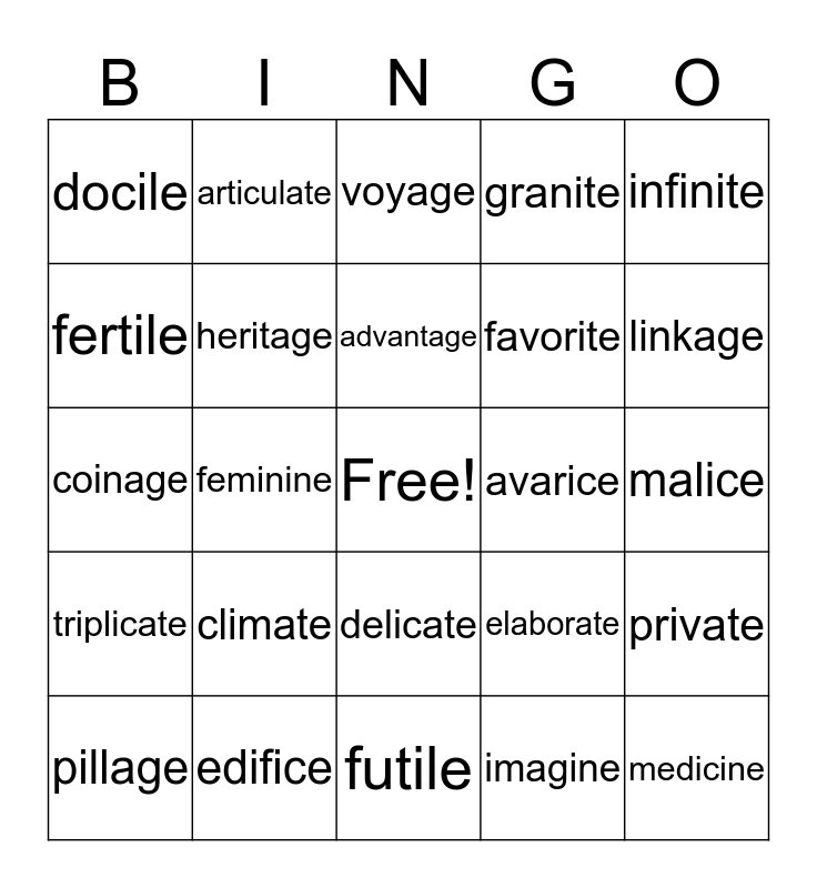 This bingo card has a free space and 42 words: justice, advantage, terrace, climate, imagine, private, medicine, language, voyage, delicate, malice, linkage, feminine, infinite, fragile, elaborate, jasmine, coinage, predestine, articulate, fertile, deliberate, respite, docile, scrimmage, garbage, favorite, pilgrimage, masculine, doctrine, inanimate, triplicate, heritage, futile, lattice, pillage, edifice, avarice, examine, vintage, granite and palate.