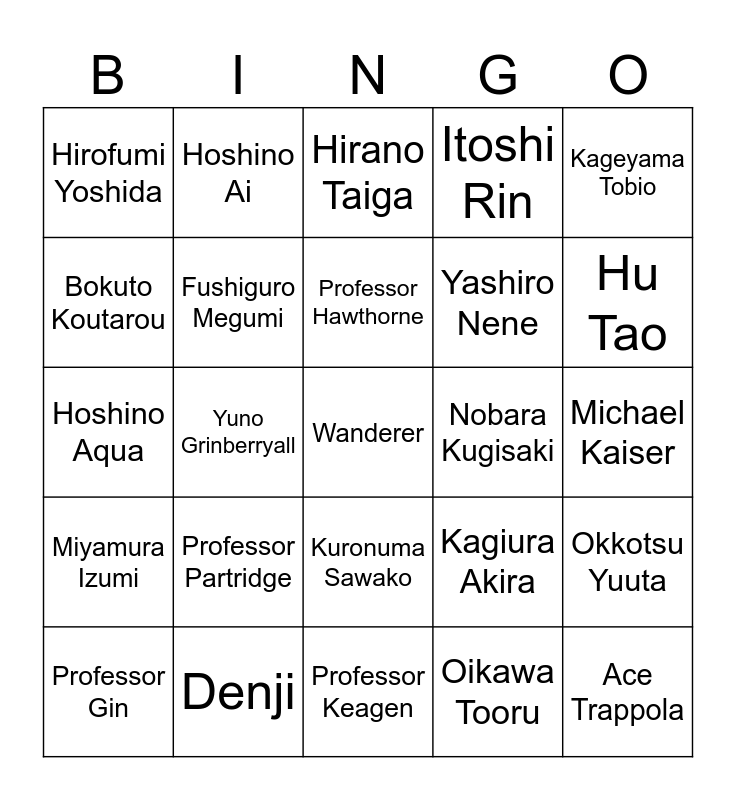 This bingo card has 25 words: Professor Partridge, Professor Keagen, Professor Hawthorne, Professor Gin, Kageyama Tobio, Hirofumi Yoshida, Bokuto Koutarou, Hoshino Ai, Nobara Kugisaki, Kuronuma Sawako, Yashiro Nene, Hoshino Aqua, Kagiura Akira, Okkotsu Yuuta, Fushiguro Megumi, Ace Trappola, Michael Kaiser, Hirano Taiga, Hu Tao, Yuno Grinberryall, Wanderer, Denji, Miyamura Izumi, Itoshi Rin and Oikawa Tooru.