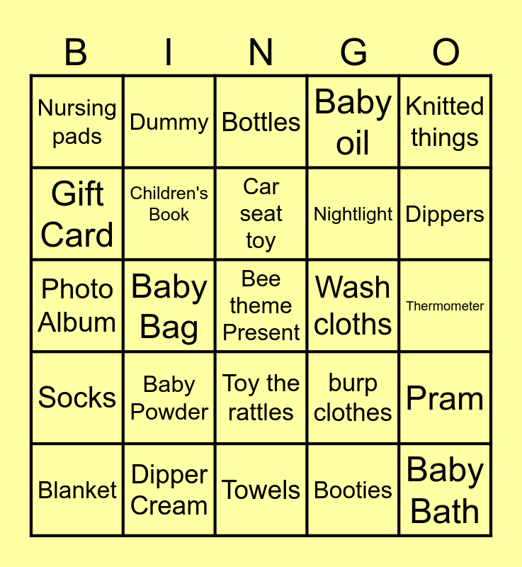 This bingo card has a free space and 34 words: Bib's, Booties, Onesie, Crib sheets, Socks, Children's Book, Knitted things, Blanket, Dummy, Stuffed Animal, Car seat toy, Bottles, Something for Mum, Swing, Wash cloths, Dippers, Dipper Cream, Photo Album, Baby Powder, burp clothes, Toy the rattles, Mitten's, Nursing pads, Thermometer, Towels, Baby Bath, Baby oil, Baby wipes, Nightlight, Gift Card, Food Plate, Baby Bag, Pram and Bath Toy's.