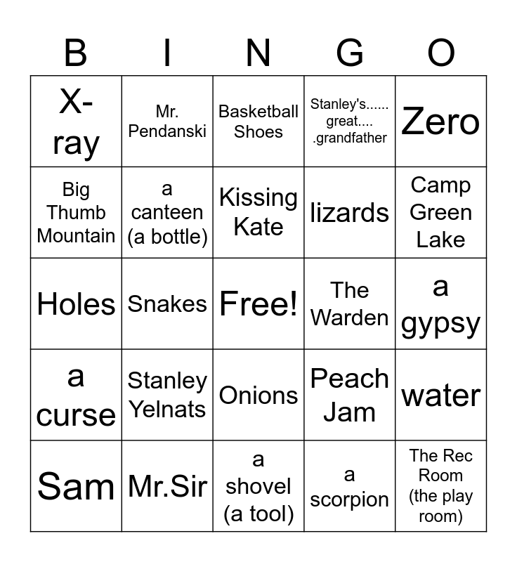 This bingo card has a free space and 24 words: Stanley Yelnats, Mr.Sir, Kissing Kate, Sam, Zero, X-ray, Big Thumb Mountain, Mr. Pendanski, The Warden, Onions, lizards, Holes, Peach Jam, water, a canteen (a bottle), a scorpion, a gypsy, Basketball Shoes, Camp Green Lake, Snakes, The Rec Room (the play room), a curse, Stanley's...... great.... .grandfather and a shovel (a tool).