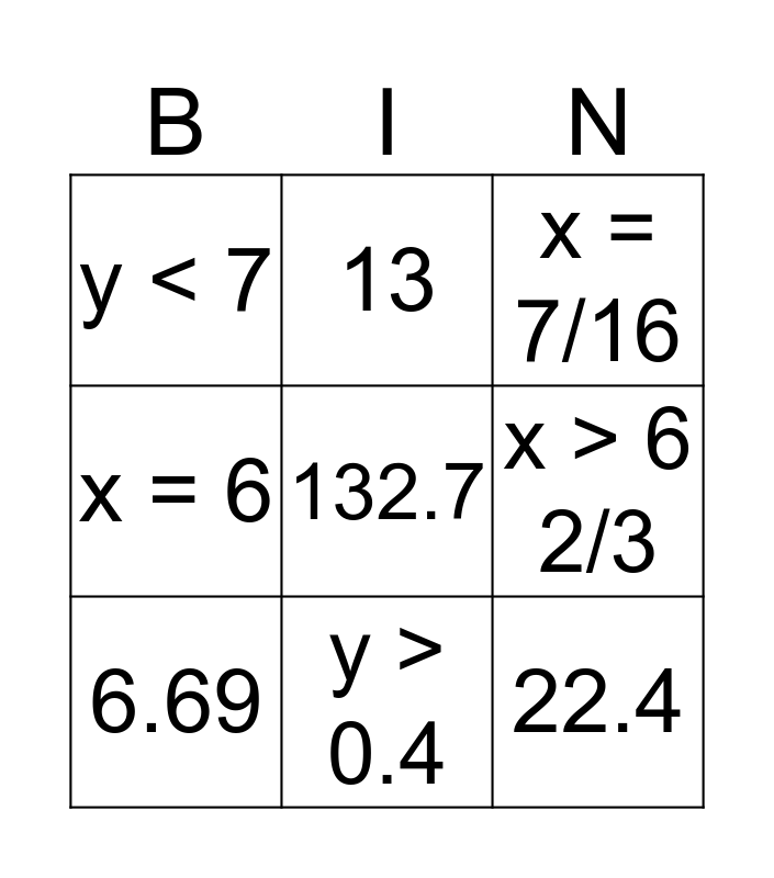 This bingo card has a free space and 8 words: x > 6 2/3, x = 7/16, 13, 6.69, y < 7, 22.4, x = 6 and y > 0.4.