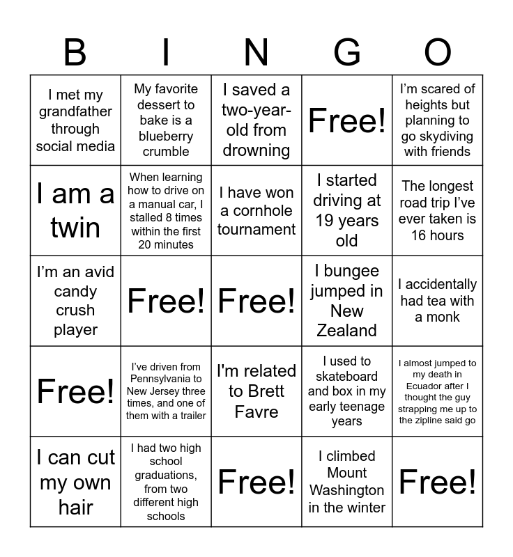 This bingo card has a free space and 24 words: I’ve driven from Pennsylvania to New Jersey three times, and one of them with a trailer, I had two high school graduations, from two different high schools, I have won a cornhole tournament, I can cut my own hair, I’m scared of heights but planning to go skydiving with friends, I met my grandfather through social media, I am a twin, My favorite dessert to bake is a blueberry crumble, I bungee jumped in New Zealand, I'm related to Brett Favre, I started driving at 19 years old, I’m an avid candy crush player, I used to skateboard and box in my early teenage years, I almost jumped to my death in Ecuador after I thought the guy strapping me up to the zipline said go, When learning how to drive on a manual car, I stalled 8 times within the first 20 minutes, I climbed Mount Washington in the winter, I accidentally had tea with a monk, I saved a two-year-old from drowning, The longest road trip I’ve ever taken is 16 hours, Free!, Free!, Free!, Free! and Free!.