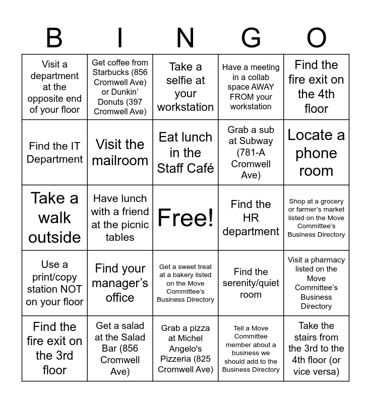 This bingo card has a free space and 25 words: Find your manager’s office, Grab a pizza at Michel Angelo's Pizzeria (825 Cromwell Ave), Eat lunch in the Staff Café, Find the fire exit on the 3rd floor, Find the fire exit on the 4th floor, Visit a department at the opposite end of your floor, Find the IT Department, Get coffee from Starbucks (856 Cromwell Ave) or Dunkin’ Donuts (397 Cromwell Ave), Find the HR department, Get a sweet treat at a bakery listed on the Move Committee’s Business Directory, Grab a sub at Subway (781-A Cromwell Ave), Take a walk outside, Find the serenity/quiet room, Visit a pharmacy listed on the Move Committee’s Business Directory, Visit the mailroom, Have a meeting in a collab space near your workstation, Shop at a grocery or farmer’s market listed on the Move Committee’s Business Directory, Take a selfie at your workstation, Locate a phone room, Have lunch with a friend at the picnic tables, Take the stairs from the 3rd to the 4th floor (or vice versa), Get a salad at the Salad Bar (856 Cromwell Ave), Use a print/copy station NOT on your floor, Have a meeting in a collab space AWAY FROM your workstation and Tell a Move Committee member about a business we should add to the Business Directory.