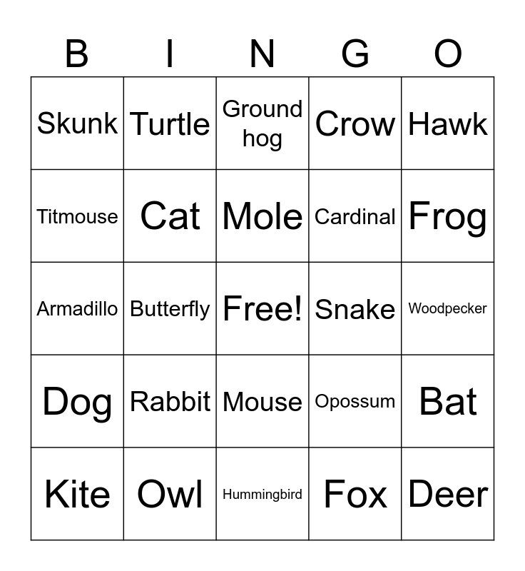 This bingo card has a free space and 34 words: Squirrel, Fox, Coyote, Raccoon, Dog, Cat, Hawk, Kite, Turtle, Turkey, Mole, Ground hog, Lizard, Blue Jay, Snake, Frog, Owl, Armadillo, Rabbit, Opossum, Mouse, Bobcat, Skunk, Woodpecker, Hummingbird, Deer, Crow, Tadpole, Cardinal, Titmouse, Firefly, Butterfly, Bat and Dove.