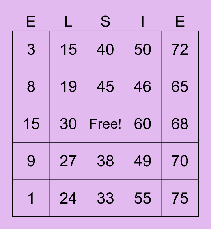 This bingo card has a free space and 24 words: 1, 27, 45, 55, 72, 3, 15, 40, 60, 68, 15, 19, 49, 70, 8, 24, 33, 50, 65, 9, 30, 38, 46 and 75.