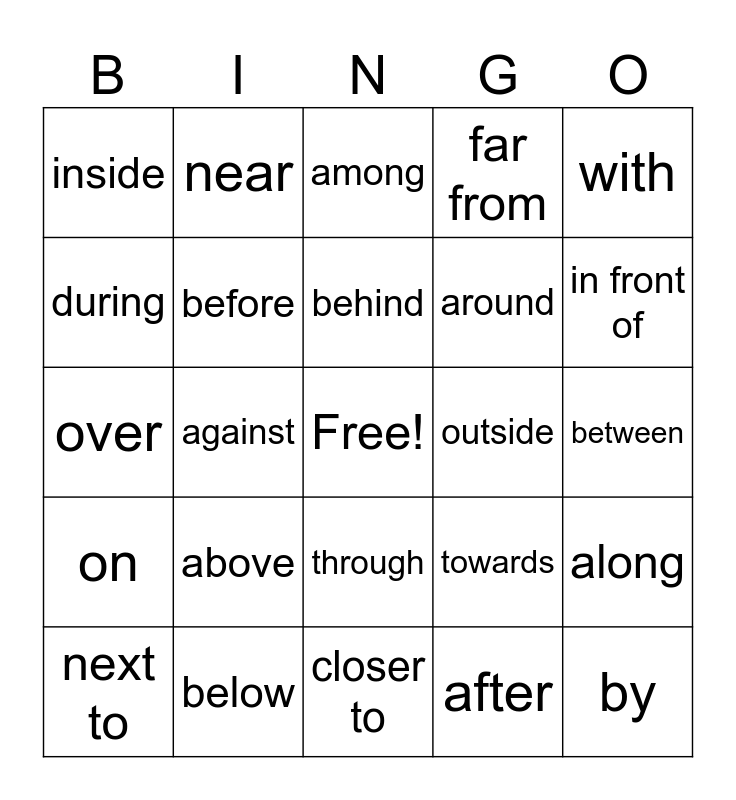This bingo card has a free space and 24 words: above, below, behind, next to, with, inside, during, near, outside, through, around, over, towards, along, before, after, between, among, in front of, against, by, on, far from and closer to.