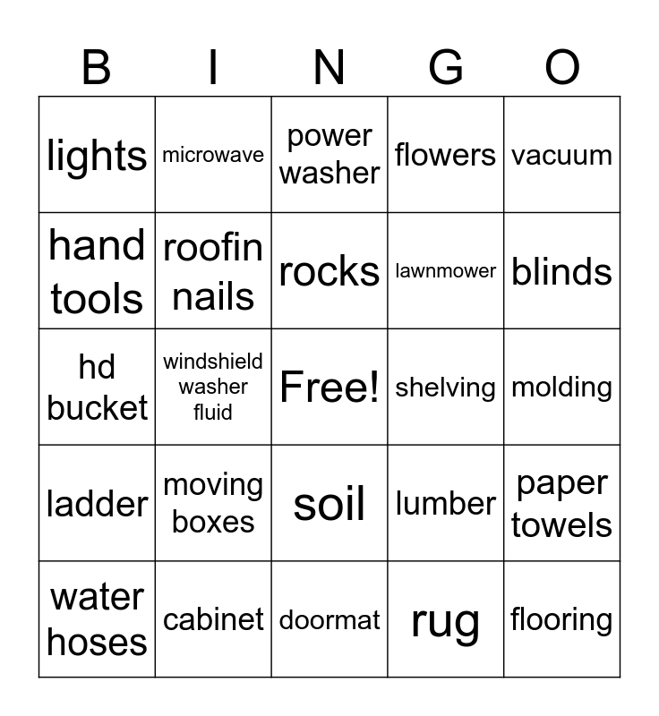 This bingo card has a free space and 24 words: moving boxes, cabinet, rocks, water hoses, vacuum, lights, hand tools, microwave, shelving, soil, lawnmower, hd bucket, lumber, paper towels, roofin nails, rug, molding, power washer, blinds, windshield washer fluid, flooring, ladder, flowers and doormat.