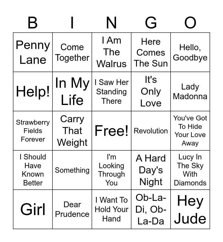 This bingo card has a free space and 48 words: Yesterday, Hey Jude, Let It Be, I Want To Hold Your Hand, Something, Love Me Do, Come Together, With A Little Help From My Friends, Help!, Twist And Shout, In My Life, Here Comes The Sun, Lucy In The Sky With Diamonds, A Hard Day's Night, We Can Work It Out, Sgt. Pepper's Lonely Hearts Club Band, I Saw Her Standing There, Revolution, Ticket To Ride, Hello, Goodbye, Carry That Weight, Ob-La-Di, Ob-La-Da, Penny Lane, It's Only Love, Can't Buy Me Love, Lady Madonna, Girl, Golden Slumbers, I'm Looking Through You, I Should Have Known Better, I Will, Eight Days A Week, Get Back, She Loves You, Dear Prudence, Yellow Submarine, I'll Follow The Sun, You've Got To Hide Your Love Away, All My Loving, Good Day Sunshine, Blackbird, Across The Universe, I Am The Walrus, Don't Let Me Down, Strawberry Fields Forever, All You Need Is Love, A Day In The Life and Helter Skelter.