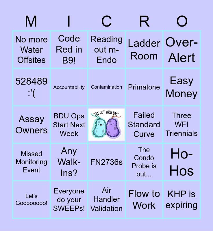 This bingo card has a free space and 39 words: Divestment, My CLIMET is Dying, Mitch's Laugh, Accountability, Let's Goooooooo!, FN2736s, Contamination, 1.000 R-Value, Over-Alert, Missed Monitoring Event, BDU Ops Start Next Week, Ladder Room, KHP is expiring, Three WFI Triennials, Failed Standard Curve, Any Walk-Ins?, 27 sets of MUC samples, No more Water Offsites, Clean CAG, The Condo Probe is out..., 528489 :'(, Air Handler Validation, Primatone, Easy Money, B3 Downflow Booth, Breakfast Burritos, Code "F", Nitrate Testing, Backlog Review, Code Red in B9!, CCP3!, Interstitial 2.5, Reading out m-Endo, Everyone do your SWEEPs!, Flow to Work, Workstreams, Ho-Hos, Assay Owners and UPE.