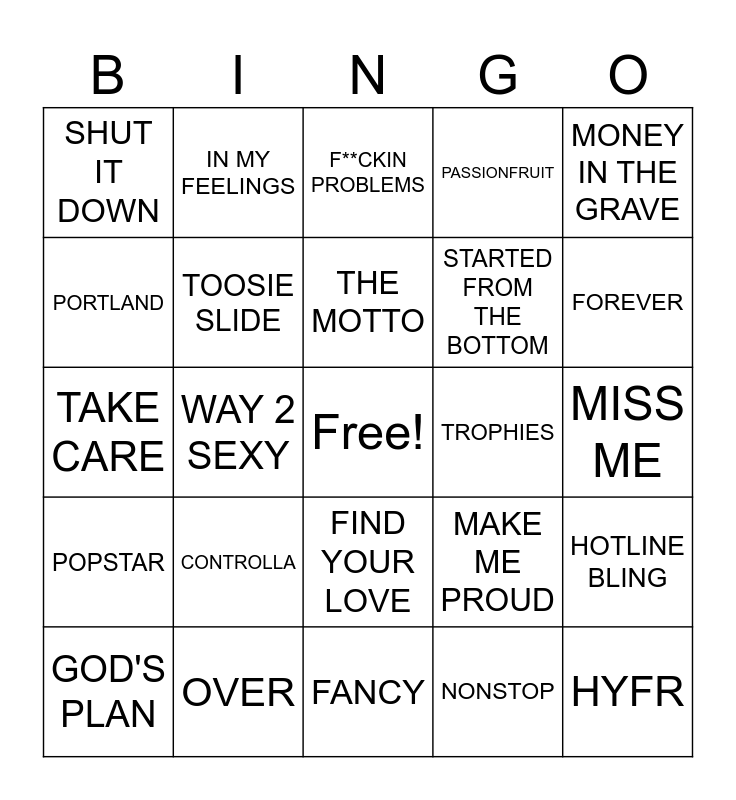 This bingo card has a free space and 33 words: JIMMY COOKS, WHAT'S NEXT, WAY 2 SEXY, LAUGH NOW CRY LATER, POPSTAR, TOOSIE SLIDE, MONEY IN THE GRAVE, GOD'S PLAN, IN MY FEELINGS, BEST I EVER HAD, THE MOTTO, F**CKIN PROBLEMS, JUMPMAN, HEADLINES, TROPHIES, FOREVER, OVER, TAKE CARE, CONTROLLA, MAKE ME PROUD, FIND YOUR LOVE, HOUSTATLANTA VEGAS, SHUT IT DOWN, MISS ME, FANCY, HYFR, PASSIONFRUIT, STARTED FROM THE BOTTOM, PORTLAND, HOTLINE BLING, I'M UPSET, NONSTOP and UP ALL NIGHT.