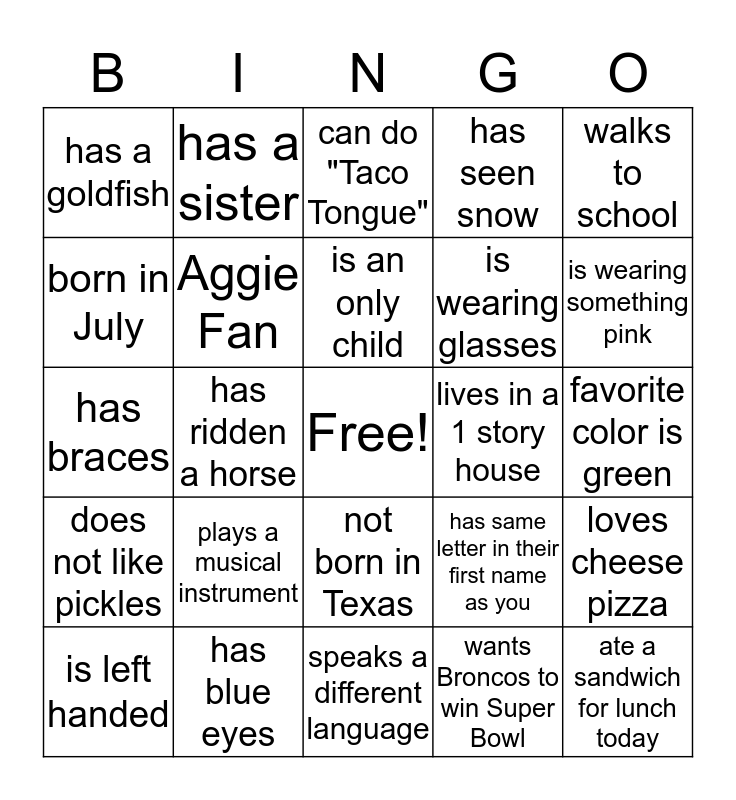 This bingo card has a free space and 24 words: plays a musical instrument, has blue eyes, is an only child, is left handed, walks to school, has a goldfish, born in July, has a sister, lives in a 1 story house, not born in Texas, is wearing glasses, has braces, has same letter in their first name as you, loves cheese pizza, Aggie Fan, wants Broncos to win Super Bowl, favorite color is green, can do "Taco Tongue", is wearing something pink, has ridden a horse, ate a sandwich for lunch today, does not like pickles, has seen snow and speaks a different language.